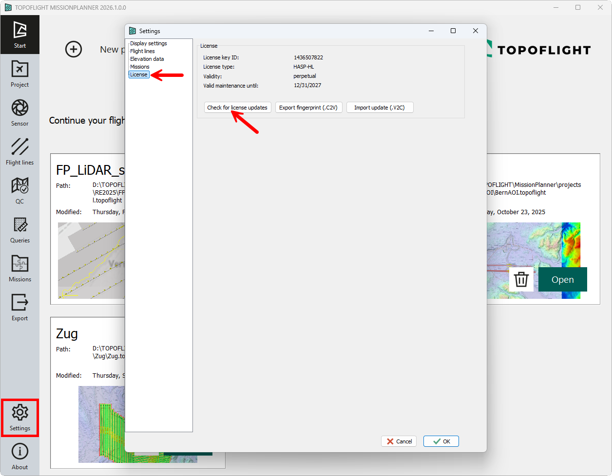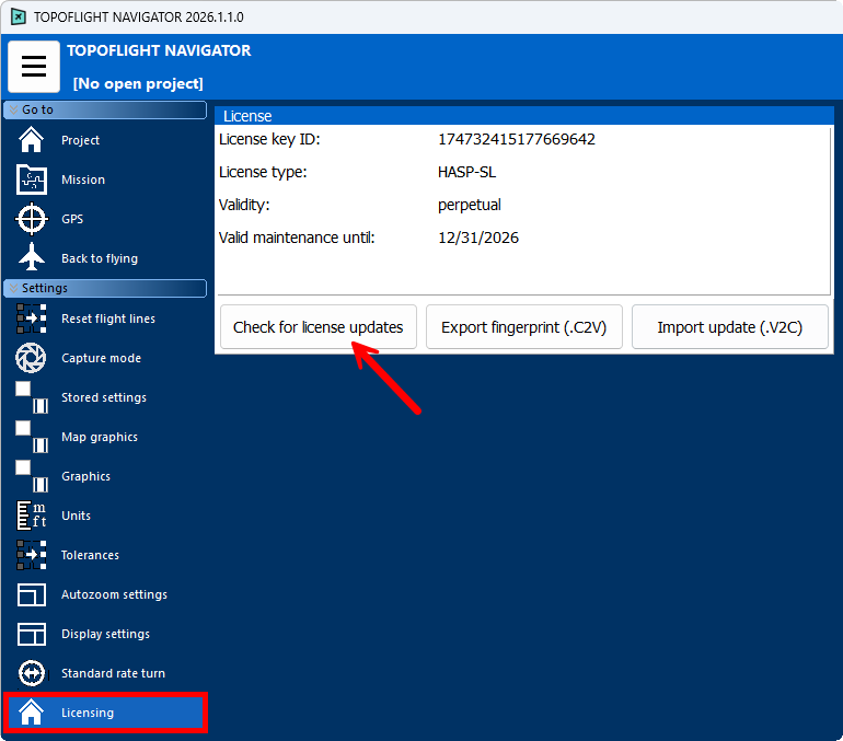 Local licenses can be updated directly in TOPOFLIGHT MISSIONPLANNER and NAVIGATOR. All other licenses require a *.V2C file update.