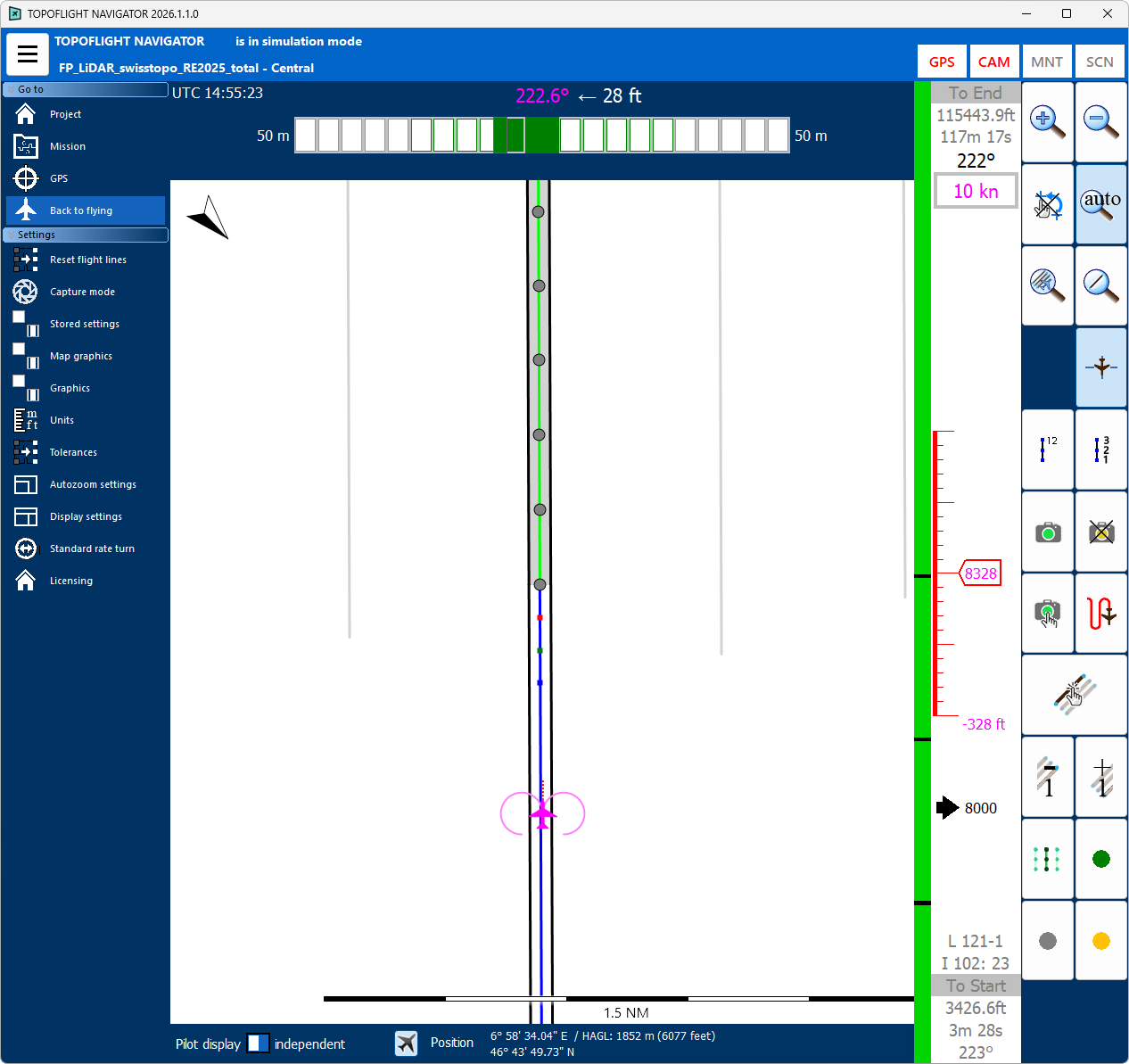 TOPOFLIGHT NAVIGATOR plays a crucial role in aircraft and helicopter navigation during image and LiDAR data acquisition. It operates based on predefined flight plans created with TOPOFLIGHT MISSIONPLANNER. These flight plans not only ensure efficient flight paths but also define designated positions for automatic triggering of the sensors. For convenient navigation, both the pilot and the operator have their own separate NAVIGATOR displays.